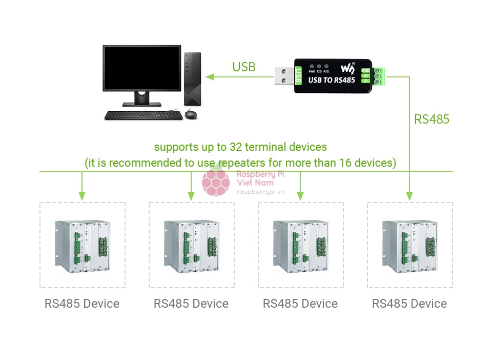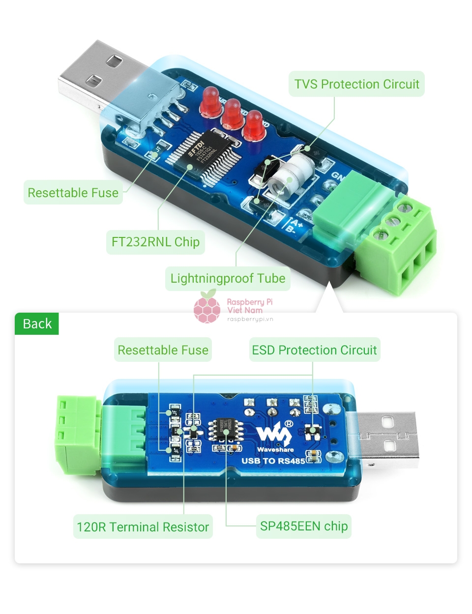Sản phẩm bộ chuyển đổi hai chiều USB sang RS485 cho công nghiệp chính hãng Waveshare do Raspberry Pi Việt Nam ủy quyền phân phối.