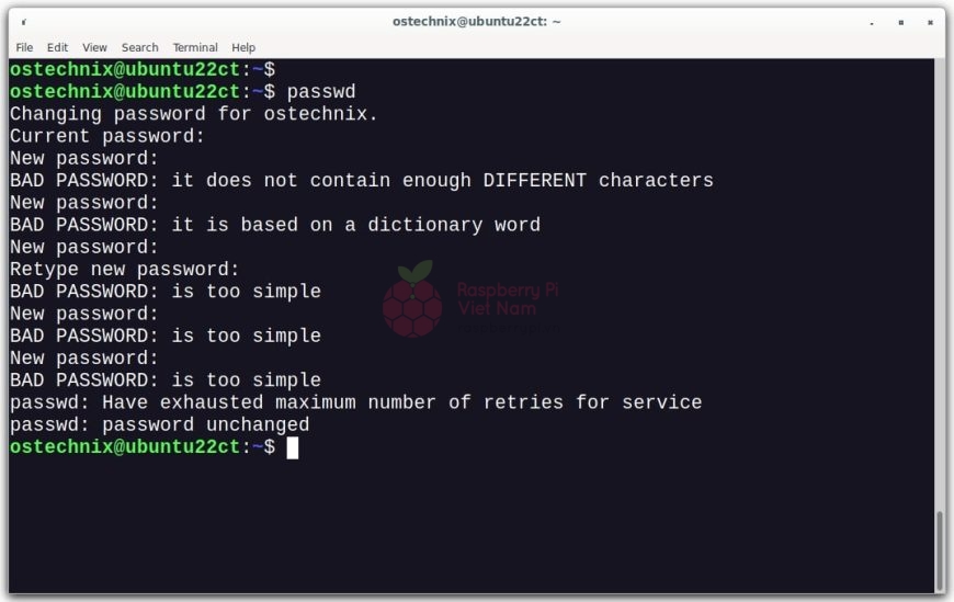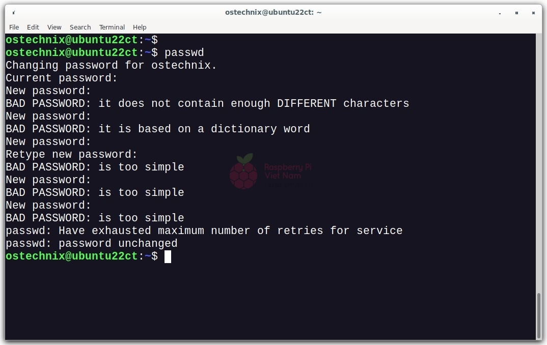 Nếu mật khẩu không đạt yêu cầu, Ubuntu sẽ hiển thị cảnh báo như: