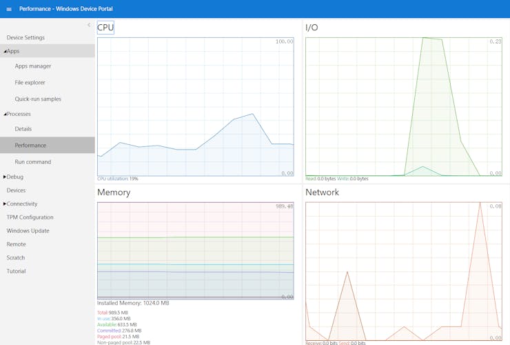 Vào Windows Device Portal để xem hiệu suất của hệ thống, ví dụ như 192.168.0.102:8080. Tổng quan về hiệu suất của CPU, bộ nhớ, được truyền mạng và IO đều có thể được truy cập vào theo dõi với đường dẫn: Precess -> Performance. Kết quả như dưới đây: