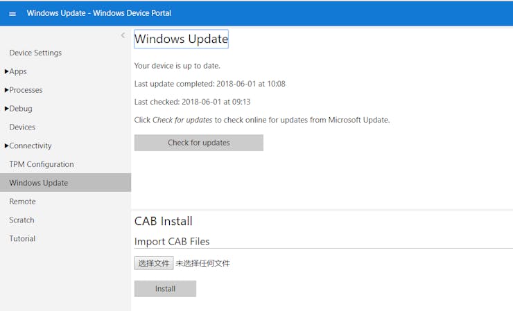 Nếu bạn muốn cập nhật lại hệ thống để vá lỗ hỏng, nâng cấp driver, tải phiên bản mới nhất của Windows 10 IoT Core, Bạn chọn Windows Update trong Windows Device Portal, tất nhiên là quá trình cập nhật sẽ diễn ra tự động.